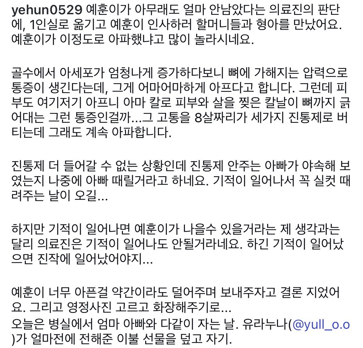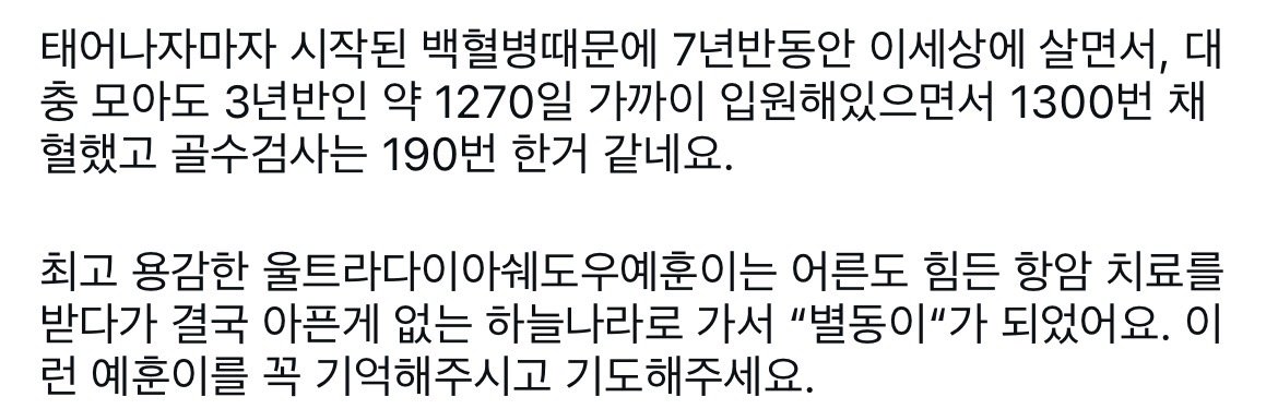 아기때부터 백혈병에 걸렸던 8살 예훈이 근황... 유머관리자 2025-12-09 08:23 537 0 목록 골수이식 형, 아빠, 기증자한테 3번이나 받았음 셋다 안먹히고 항암도 계속 했는데 실패함... 삼가고인의 명복을 빕니다.