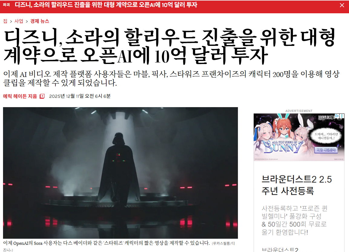 디즈니와 OpenAI가 지적재산(IP) 기반 콘텐츠를 Sora에서 생성할 수 있게 하는 공식 합의를 체결
