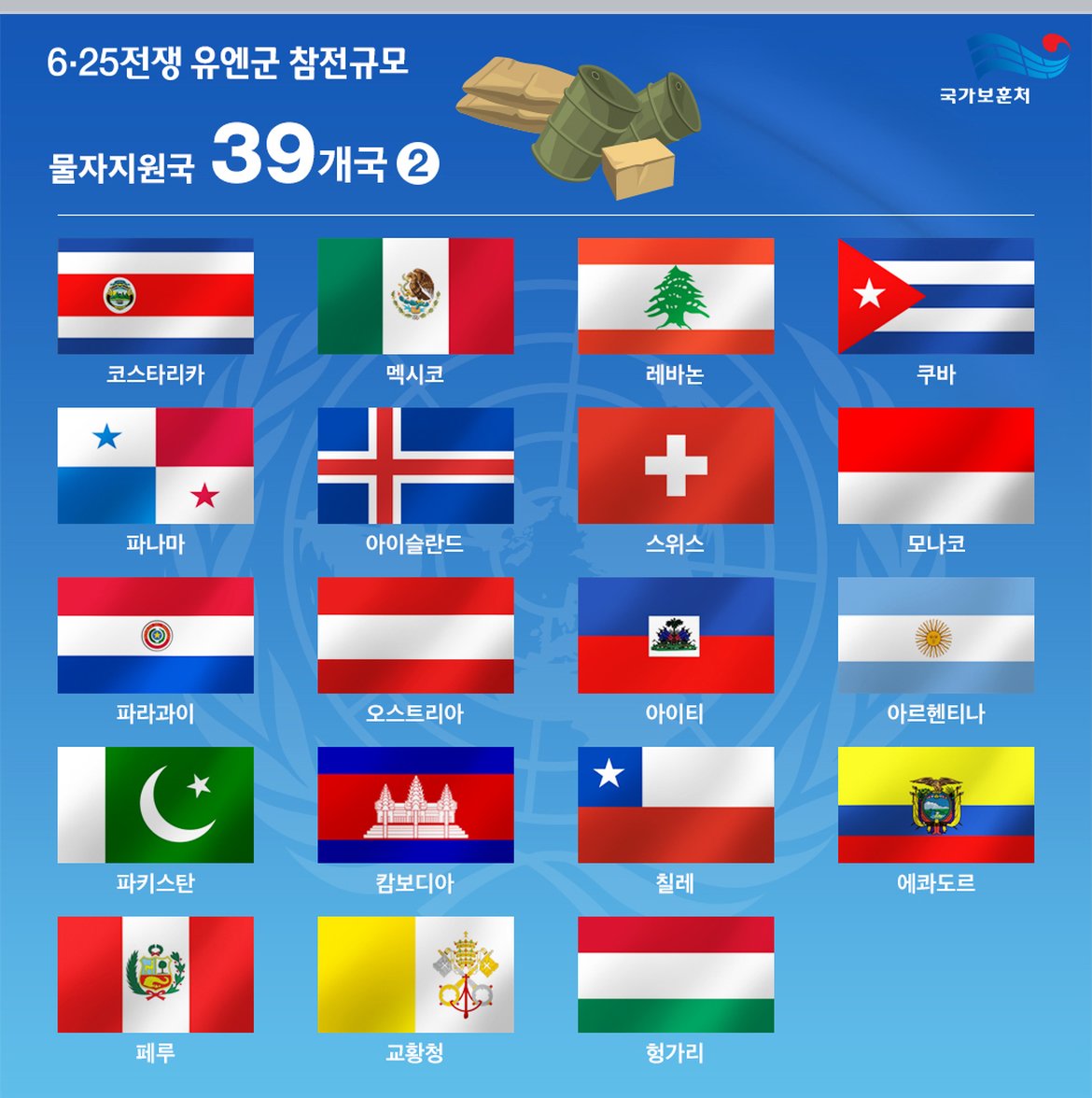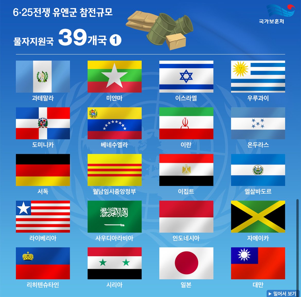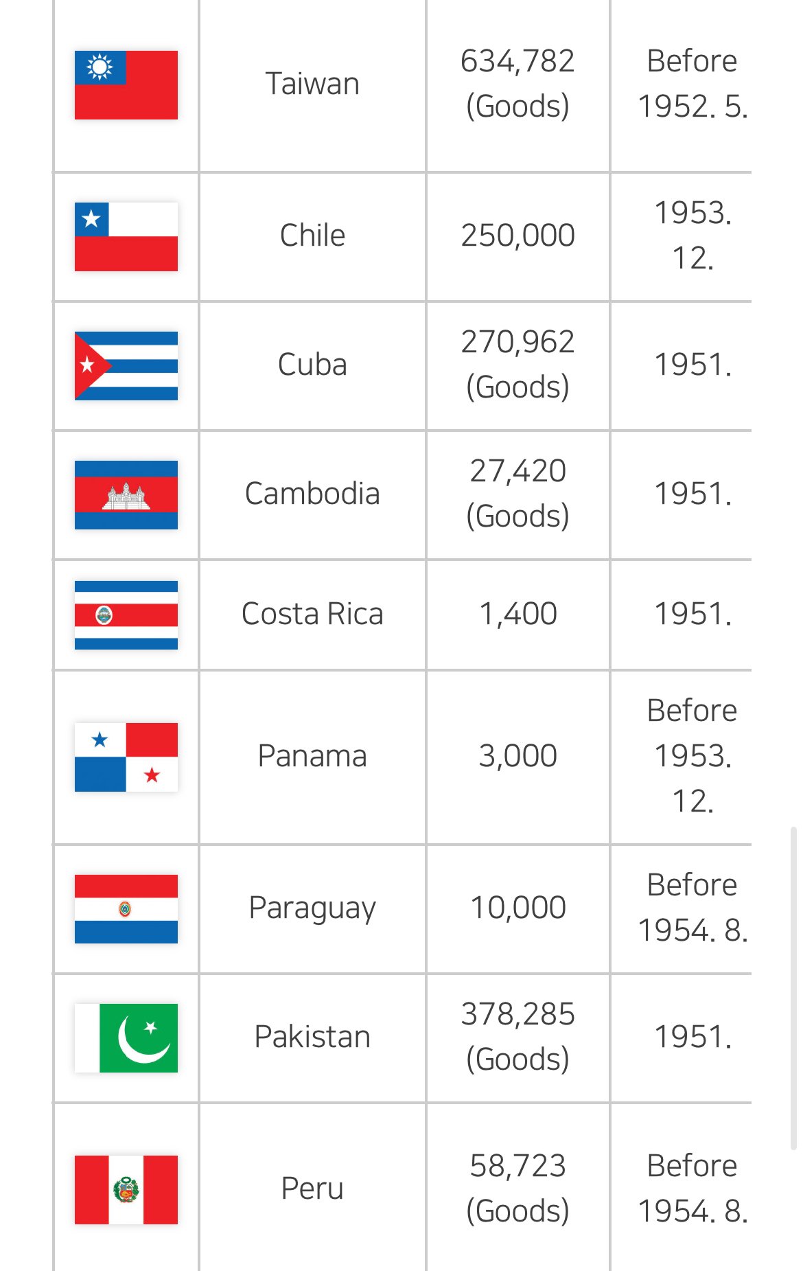 한국전쟁서 캄보디아가 줬던 도움 유머관리자 2025-12-12 08:30 523 0 목록 CRIK (한국민간구제단) 를 통해서 한국에 물자지원을 해준 초기 19개국 중 하나. 미곡 3만톤과 재정 일부를 지원해줬으며, 물자 지원 부분에선 태국과 비슷한 수준 (태국은 미곡 4만톤 지원) 으로 국가 역량 내에서 최대한 한국을 지원해줬던 국가 중 하나임
