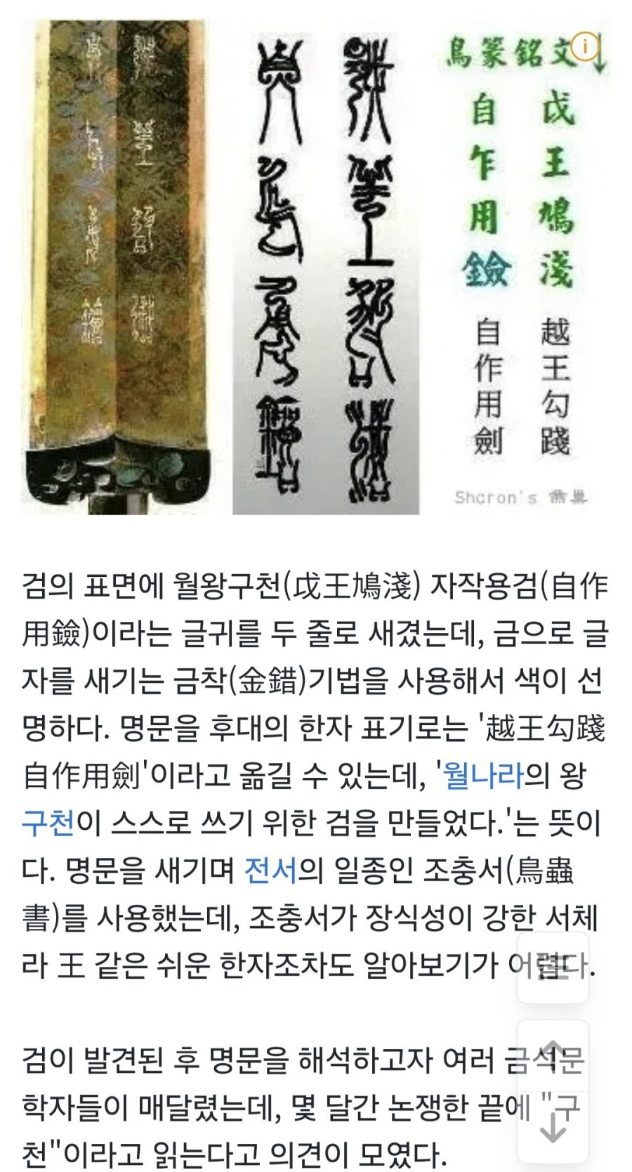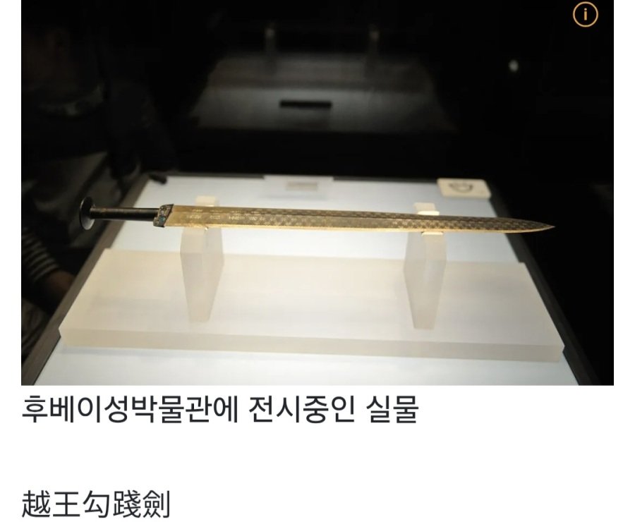 중국 춘추시대 월나라 왕 구천이 사용한 검 유머관리자 2025-12-12 22:07 507 0 목록 춘추시대 패왕 월나라 임금, 월왕 구천의 검 구천은 고사성어 와신상담의 주인공이자 춘추시대의 패왕 그후 월나라를 멸한 초나라 왕실에 입수되었다고 보고 있음 2500년이 흘러도 녹슬지 않아 지리게 만들었다고