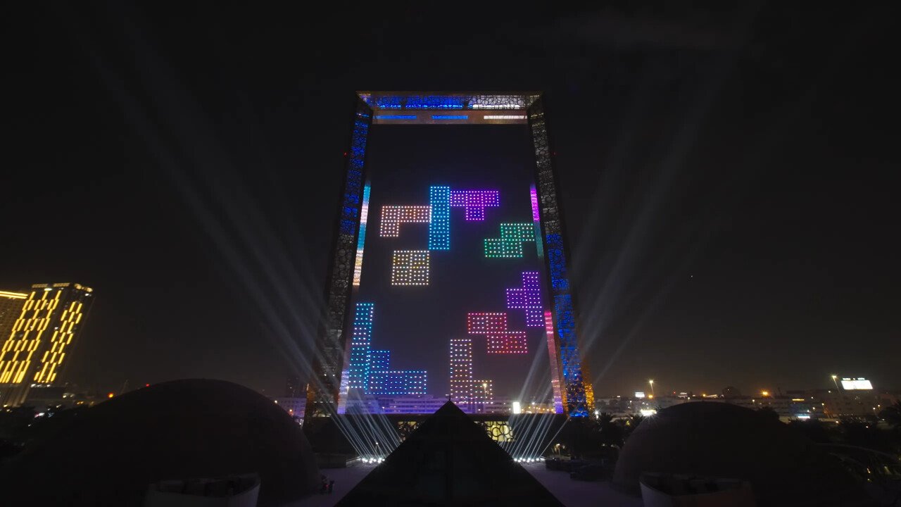 저 공간에 어떻게? 2000개 이상의 드론을 동원하여 테트리미노(블록)를 구현했다고 하네요.