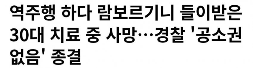 며칠전 역주행으로 람보르기니 반파시킨 사건 근황 유머관리자 2025-12-02 16:35 570 0 목록 역주행 하다 람보르기니 들이받은 30대 치료 중 사망…경찰 '공소권 없음' 종결 - 노컷뉴스 역주행한 폭스바겐 차주 사망으로 사건 종결 람보르기니 차주만 씁슬한 결말이군요
