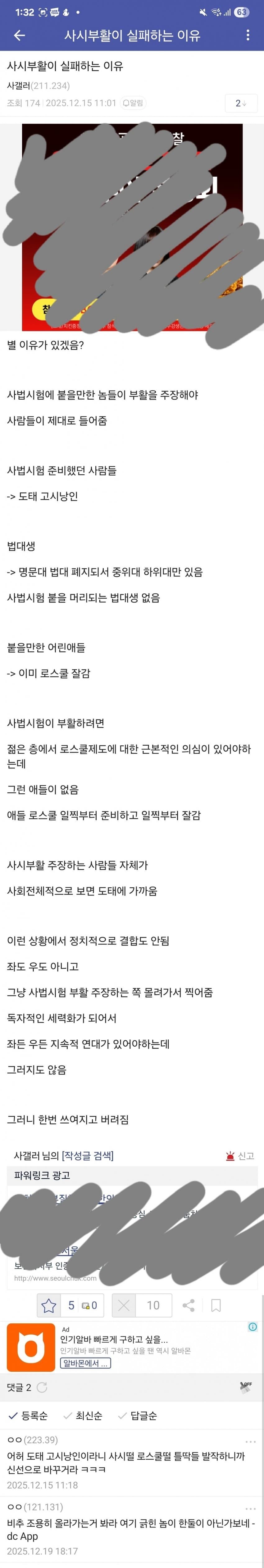 사법고시 부활이 실패하는 이유 유머관리자 2025-12-22 14:26 527 0 목록 주장하는 사람들이 대개 떨거지임. 사시 출신 변호사는 이미 로스쿨 출신이랑 어울어져서 잘 살고 있는데, 사떨한 과거 법대 출신 비롯해 사시든 로스쿨이든 진입 자체를 못하는 사람들만 물고빨고 죽은 아이 부랄 만지는중