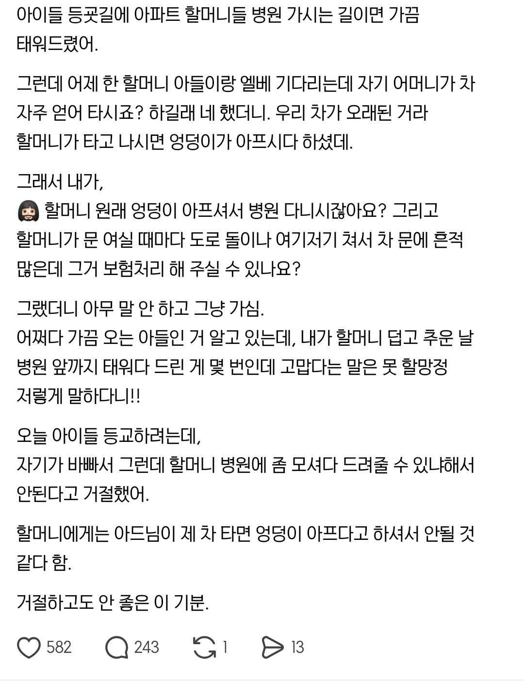 동네 할머니 병원 몇번 태워다 드렸는데.. 유머관리자 2025-12-03 13:51 601 0 목록 실제로 동네 어르신들 선의로 태워드렸다가 사고나거나 타고나서 아프시다고 보험처리 or 병원비 요구받는 경우는 사례가 종종 있다고...