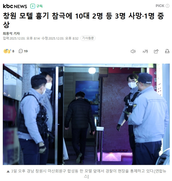 창원 모텔 흉기 참극에 10대 2명 등 3명 사망·1명 중상 유머관리자 2025-12-03 23:01 520 0 목록 창원 모텔 흉기 참극에 10대 2명 등 3명 사망·1명 중상
