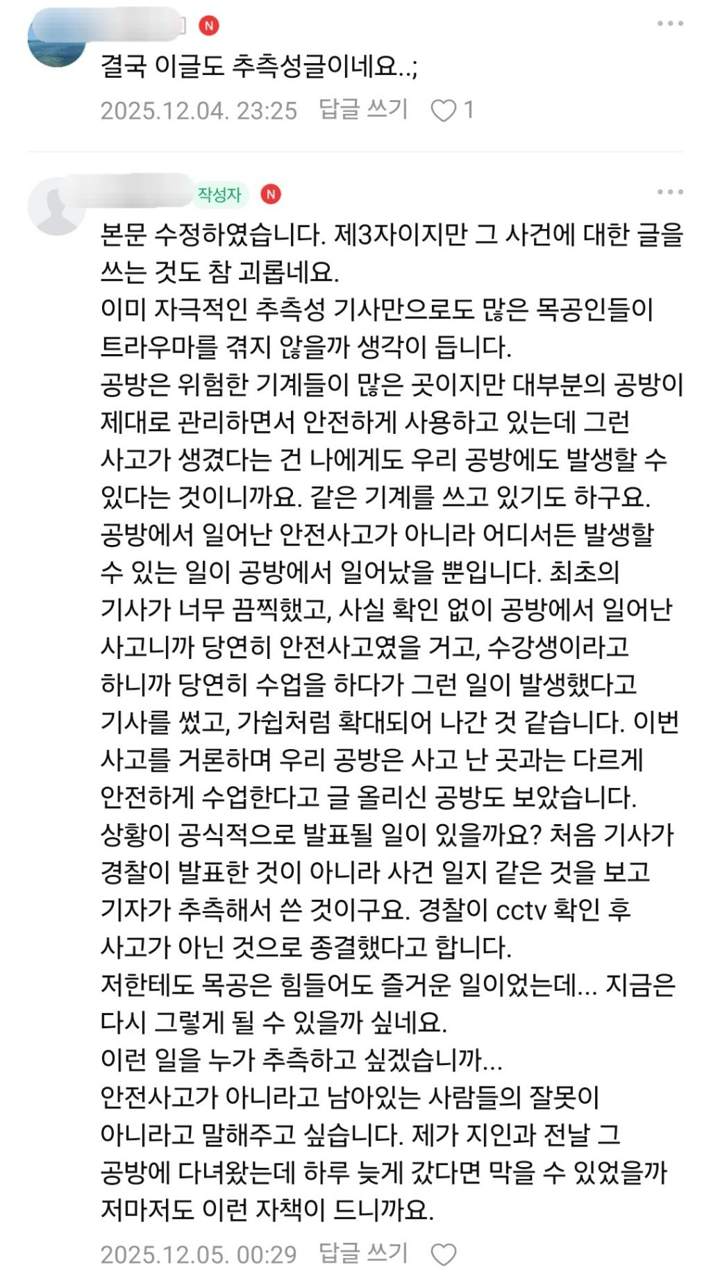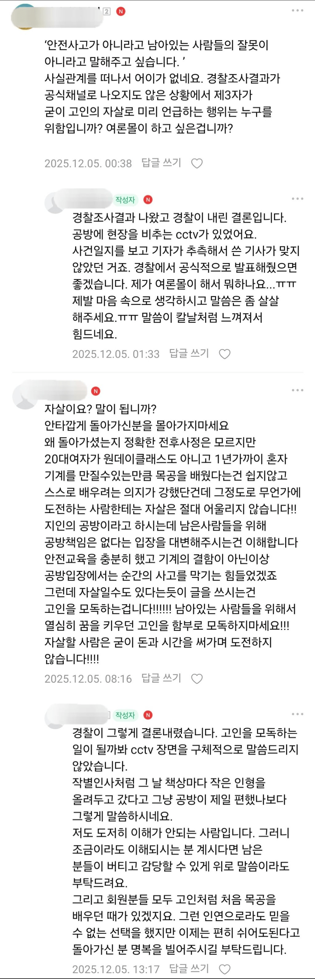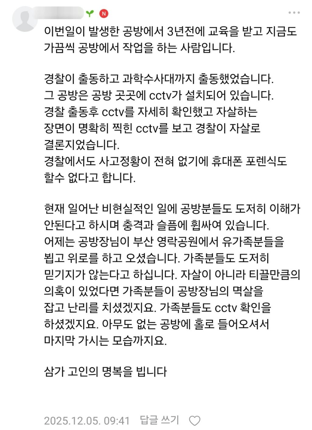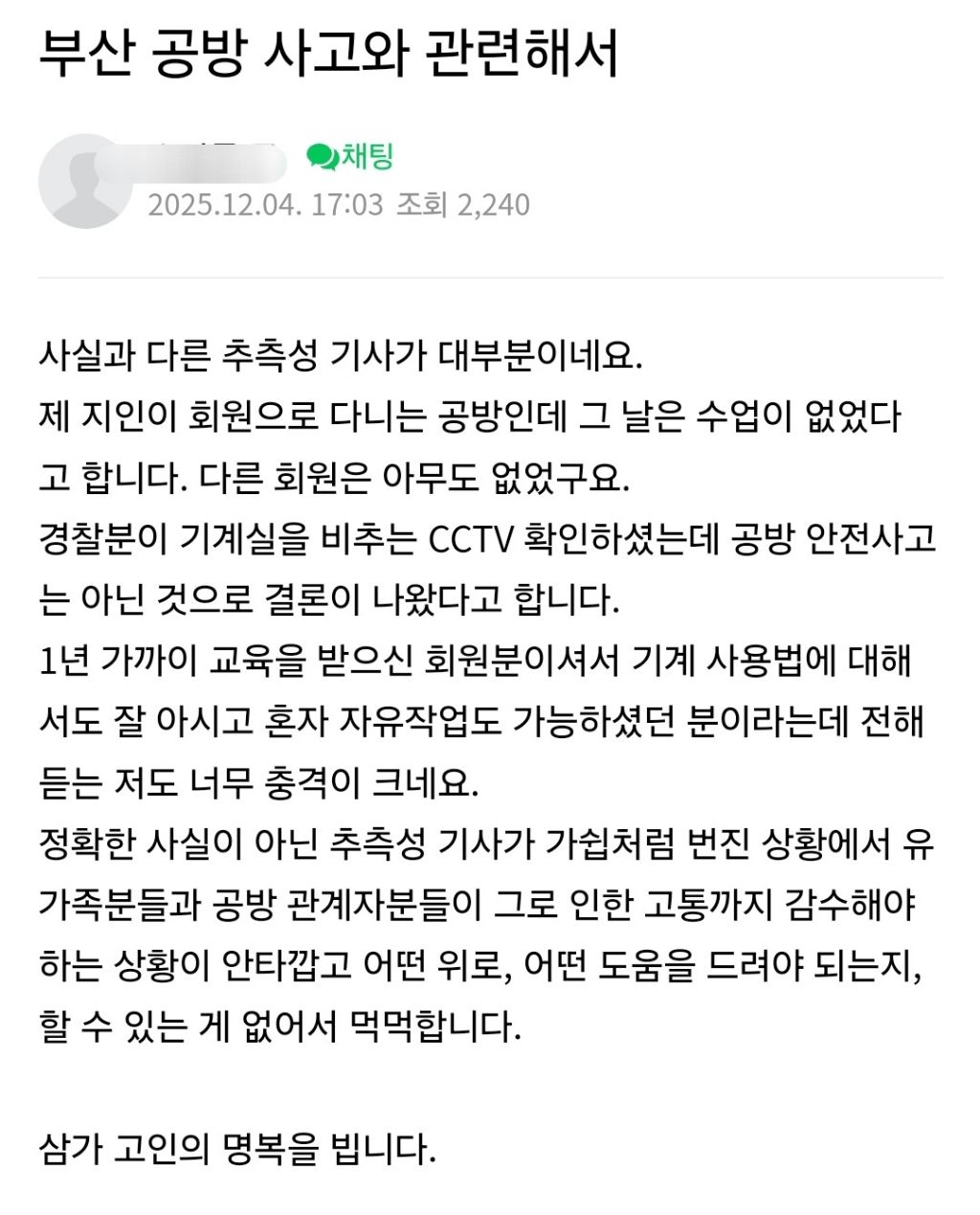 부산 공방 사망사고 관련해서 네이버에 올라온 글