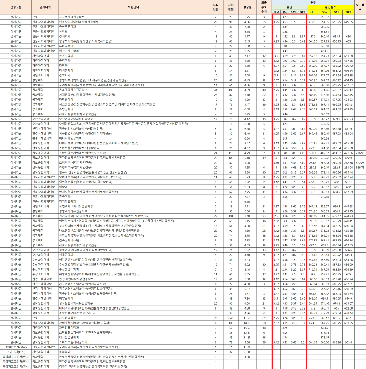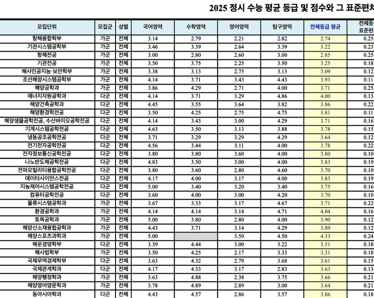 입결은 해사대, 특히 항해학과 인기로 인해 2후~3후까지 편차가 큼.
