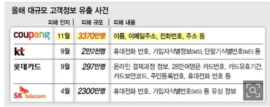 쿠팡에서 유출된 정보들은 현대 사회에서 한 사람을 나타내는 지문 혹은 신원 같은 정보나 마찬가지임.