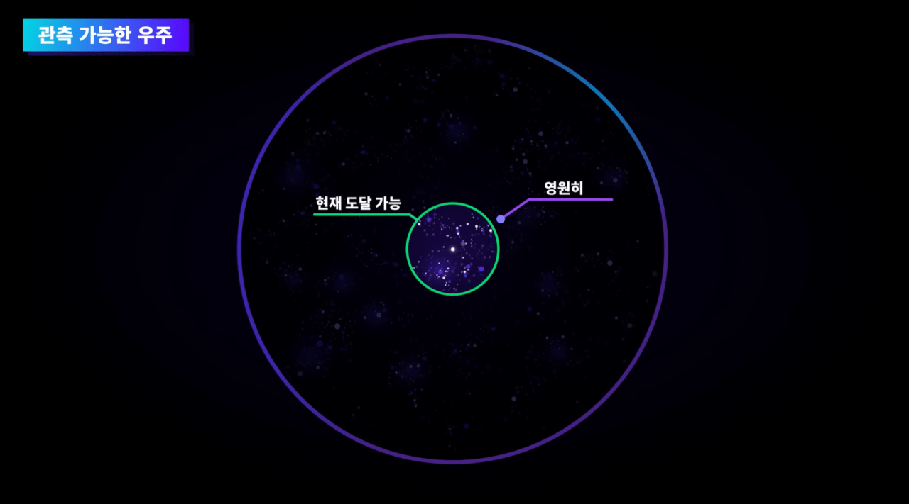 이 지평선을 넘어간 은하들은 팽창 속도 때문에 우리 시야에서 영원히 멀어지게 되는데, 지금 이 글을 읽는 순간에도 초당 약 6만 개의 별들이 이 지평선을 넘어 우리에게서 영원히 사라지고 있다고 합니다.